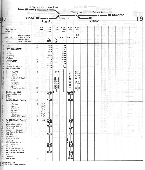 Recordaros que este tren primero circulaba los miercoles viernes y domingos sentido Alicante-Bilbao/Irun y en sentido contrario los martes jueves y sabados y posteriormente su circulacion se hizo diaria, hasta que Renfe empezo a quitar trenes expresos nocturnos y hacerlos diurnos, que fue cuando lo redujo a una circulacion semanal hasta su total desaparicion en este año, su circulacion por Tarragona, que coincidia en parte con la reduccion de las circulaciones, era por dos razones, la primera todo el recorrido era de traccion electrica y la linea esta abierta las 24 horas y la segunda el cierre de la linea de Teruel por la noche, ya que solo tenia ese tren de viajeros por la noche, supongo ademas los mercancias de aquellos años.-