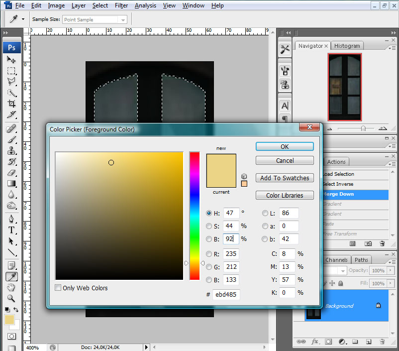 A la zona exterior a esta selección, el marco de la ventana, le reduciremos la luminosidad un 85%, y a la zona de la selección la rellenaremos con un degradado basado en un color amarillento anaranjado tenue: