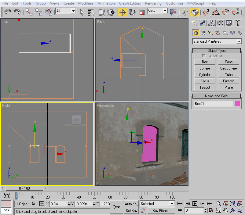 Ahora iremos al 3ds para crear un polígono sobre la ventana que deseemos que esté iluminada por la noche. Dejaremos visible tan sólo el cuerpo de la casilla "cercano" 1_0256_Casilla, y sobre el Viewport Right crearemos un cubo de las dimensiones aproximadas de la ventana a cubrir, y le daremos suficiente longitud para que, partiendo del eje central de la casilla, llegue a cubrir la cara de la ventana: