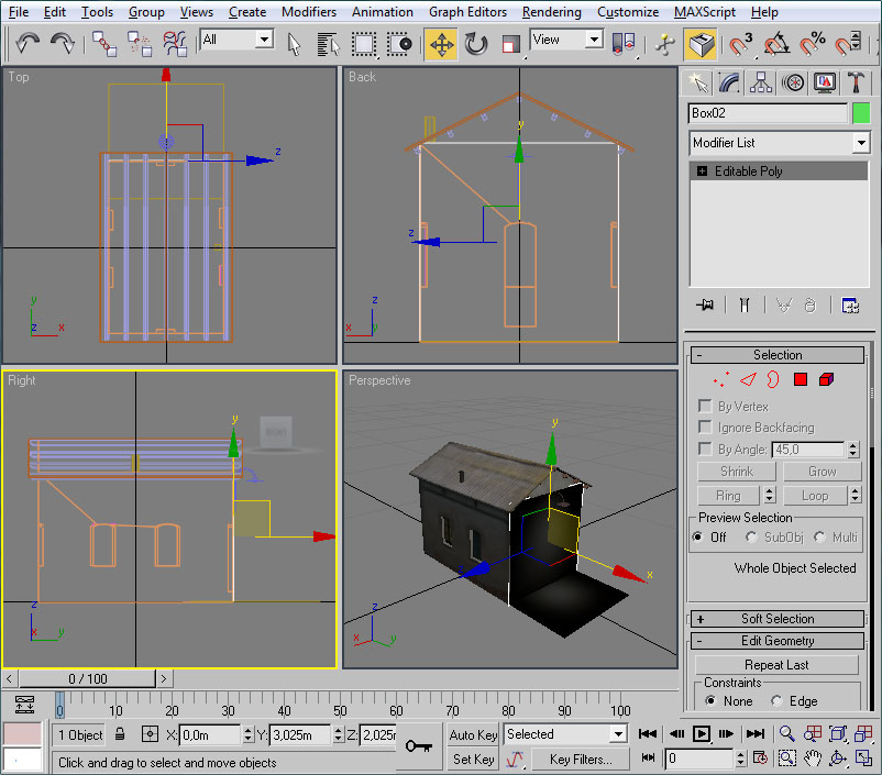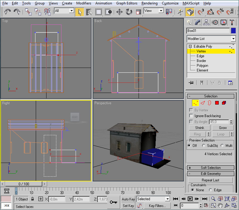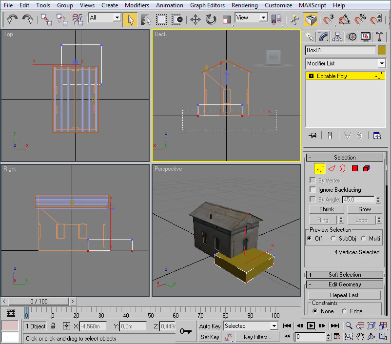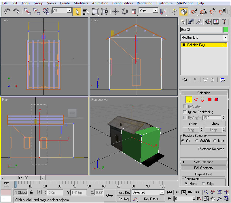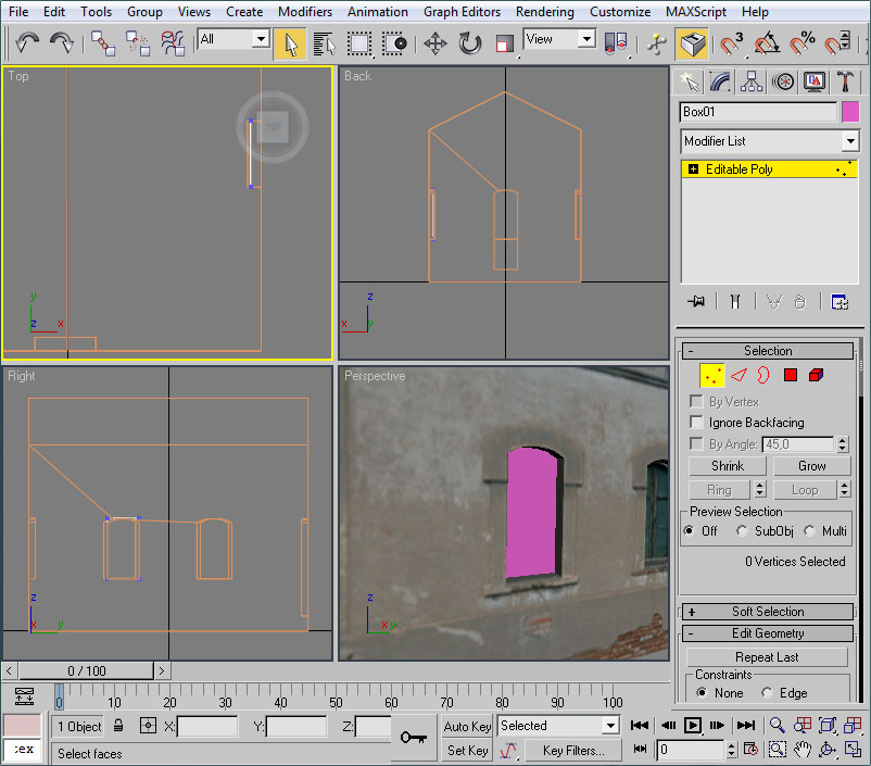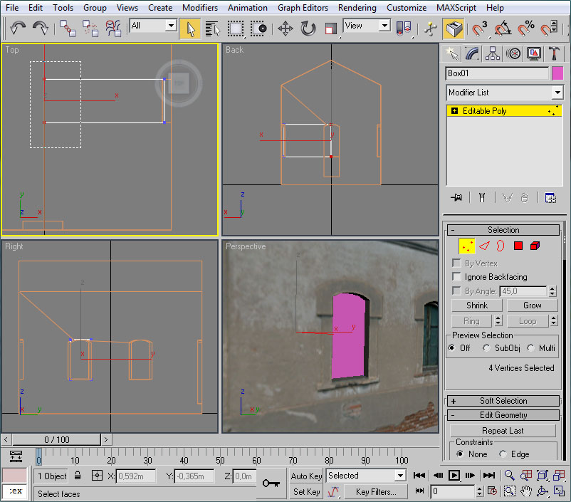 Con el mismo procedimiento crearemos un polígono para cubrir la fachada frontal del edificio. El cubo será esta vez de 4x4x4 metros, y los vértices a eliminar lo serán los "posteriores" del cubo: