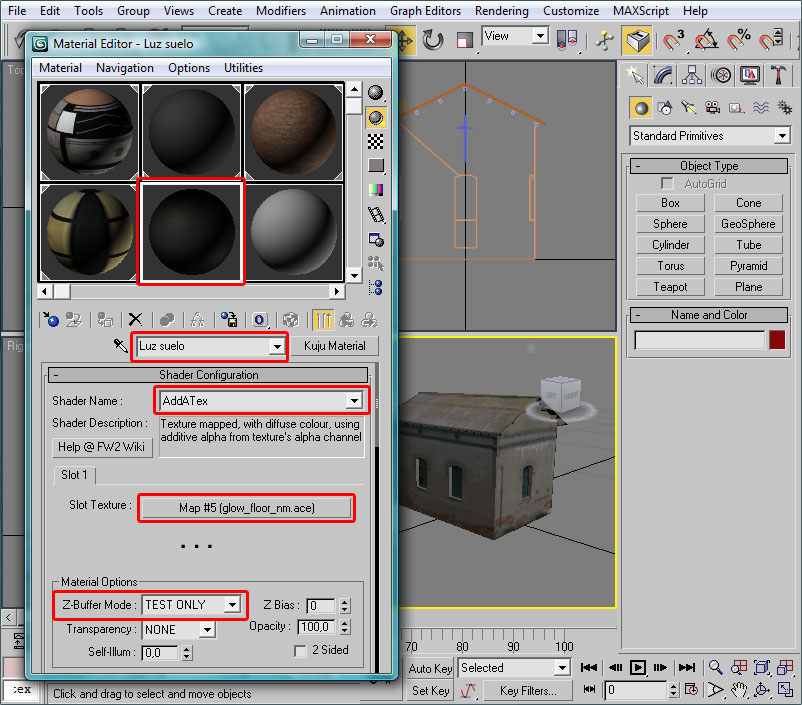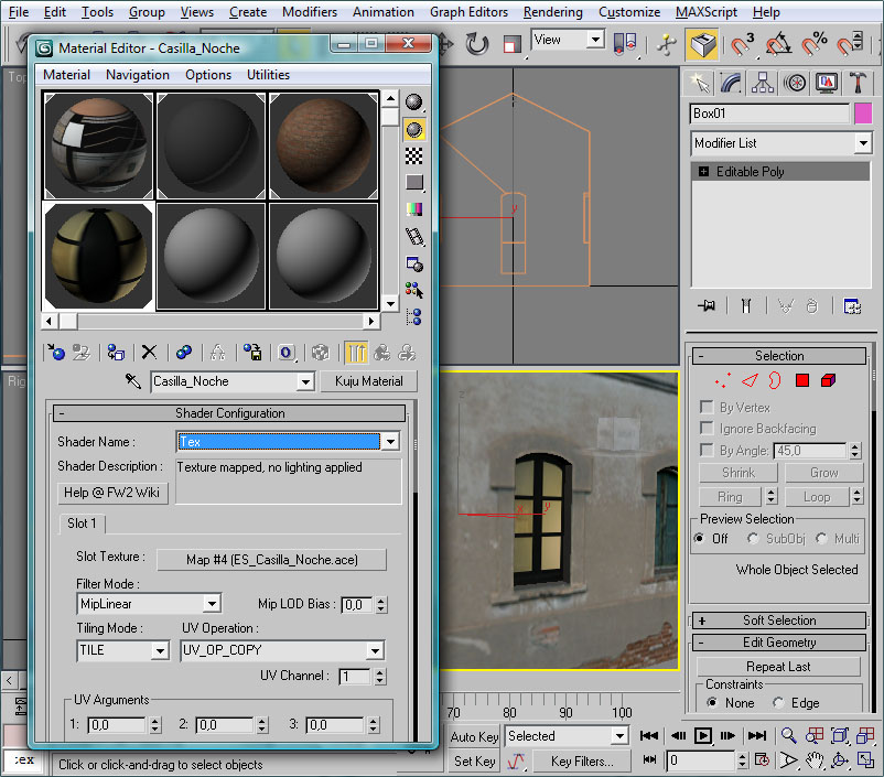 Le he llamado "Casilla_Noche", y he asignado el shader "Tex", al cual le he cargado en el Slot 1 (el único de este shader) la textura "ES_Casilla_Noche.ace". Este shader no necesita que ajustemos ningún parámetro, y es prácticamente idéntico al estándar "TexDiff", con la salvedad de que no está afectado por la luz "difusa", es decir, por la luz ambiente. Dicho en otras palabras, la luminosidad de la textura se preservará con independencia de si es de día o de noche, de si está en la fachada iluminada de la casa o en la fachada en sombra, etc. Por tanto, este shader es ideal para representar por la noche objetos iluminados, interiores de coches de pasajeros, de cabinas de locomotoras, y todo lo que se nos ocurra que deba mantener una cierta "luz propia".