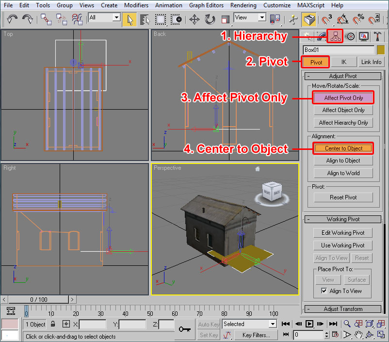 Ahora centraremos pivote (gizzmo) del polígono en la cara superior. Para ello, con el polígono seleccionado: