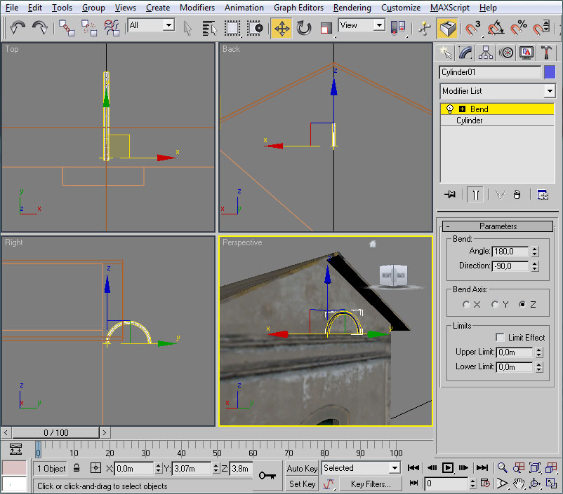 Si la ventana de la casilla fuera cuadrada ya tendríamos el patrón para crear el hueco en la fachada, pero en este caso, como en muchos edificios ferroviarios, la ventana tiene forma de arco en su lado superior. Vamos a darle esta forma al cubo auxiliar.