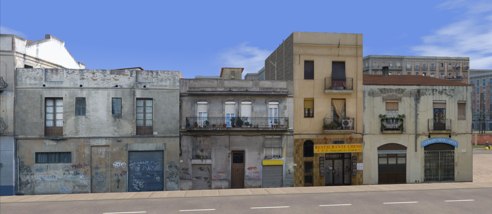 Un par de edificios suburbanos (en este montaje son el primero y el último). Las pintadas y el pésimo estado de conservación son propias del suburbio, aunque en el caso del último edificio (el del "Colmado Margarita") los vecinos se esfuerzan en mantenerlo limpio (este edificio también se puede usar perfectamente entre los edificios rurales, con los que no desentona).