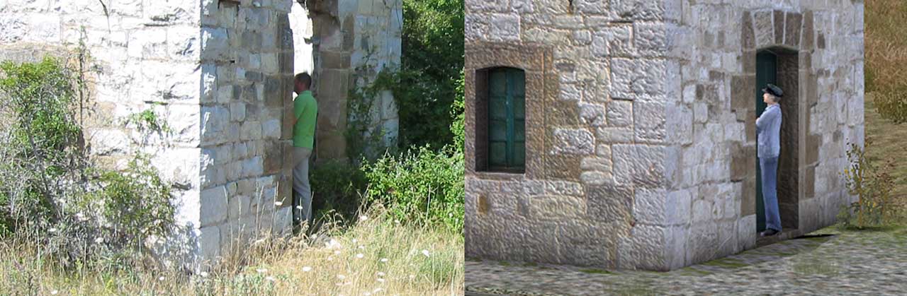 La otra es una composición con una foto real del mismo edificio, antes de su actual restauración. Considérese que las piedras de la clave de la puerta habían sido sustraidas con lo que el hueco parece mucho mayor de lo que era. Aún así, hay referencia sobradas en las del quicio para ver cual es el tamaño. La persona del polo verde medía como 1,80 aproximadamente.