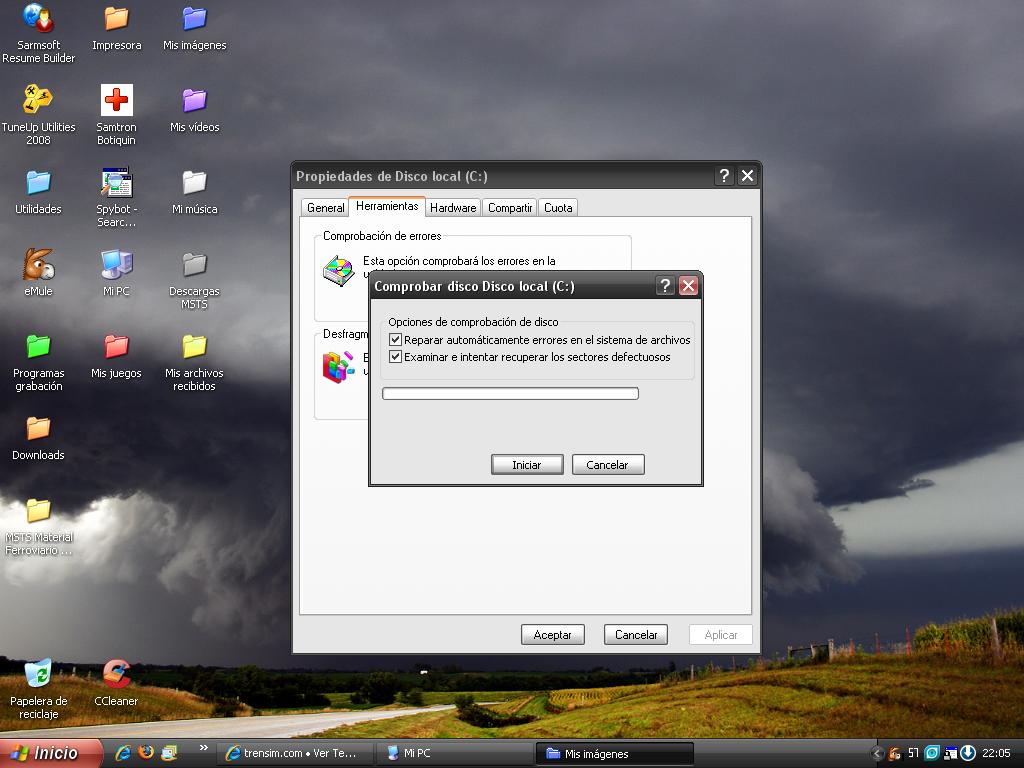 seleccionas las 2 casillas como en la captura y lo más seguro es que te diga que sólo se puede hacer eso cuando reinicies el equipo; pues lo reinicias y entonces empezará a hacer la comprobación de errores. Cuando termine, si te ha solucionado los posibles errores del disco duro, ya podrás desfragmentarlo (por supuesto, para hacer todo esto, no tiene que haber ningún programa funcionando, a ser posible ni el antivirus, tanto para la comprobación de errores, como para la desfragmentación)