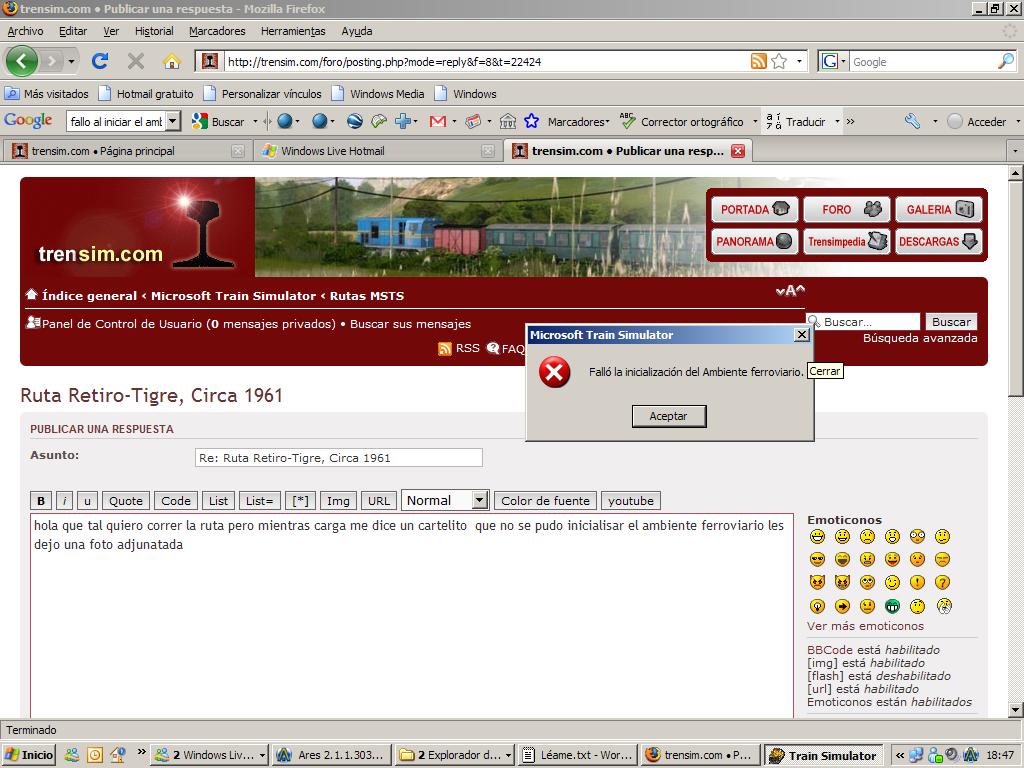 elsanisidrense escribió:hola que tal quiero correr la ruta pero mientras carga me dice un cartelito que no se pudo inicialisar el ambiente ferroviario les dejo una foto adjunatada