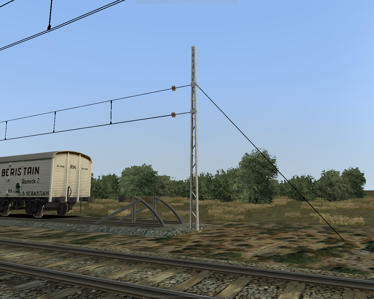 Por último, la vía incorpora, si así lo desea el creador de la ruta, catenaria de doble hilo de contacto, que irá acompañada de unos postes P2, todo ello de la compañía del Norte: