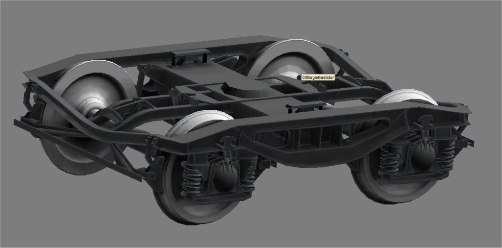 De entrada, he modelado un bogie Y21-CSE completamente nuevo, podeis ver una captura. Falta por realizar los LODs y la versión de 1,80mts. Las ruedas son una adaptación reduciendo polígonos, de unas que me pasó Pizias. Los topes y los arrastres amarillos son de LBA.