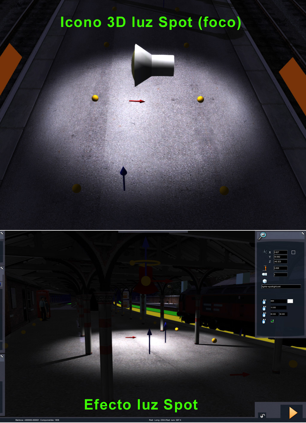 Estamos trabajando la iluminación de rutas, no de locomotoras, por lo que las luces spot las colocaremos normalmente de forma vertical: