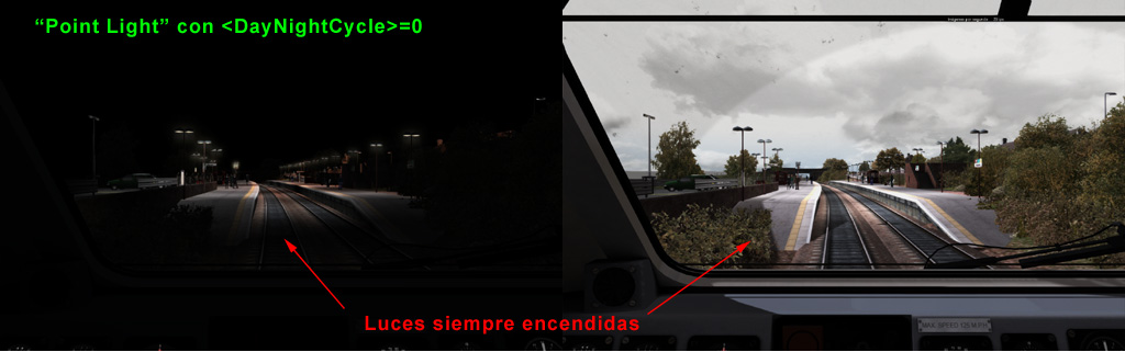 Pero claro, esto genera un problema: en las estaciones con interior o bajo tierra, si el creador de la ruta las ha iluminado con "Point Light", de día estarán apagadas (también si las ha iluminado con "Light 100m Diffuse"):