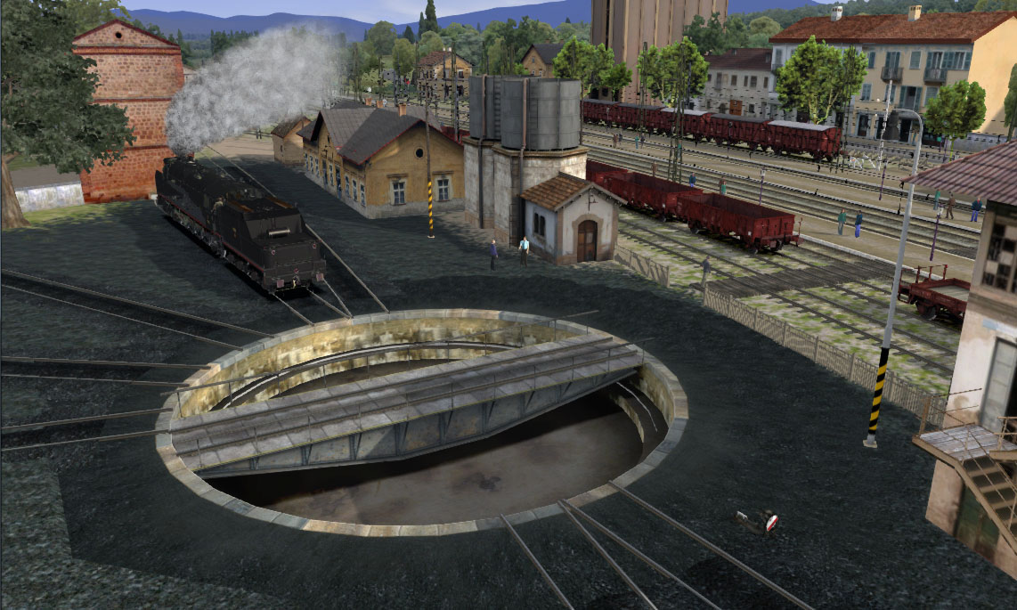 Empieza que debemos dirigirnos con nuestra locomotora hacia el depósito para allí, mediante el puente giratorio, invertir la posición de ésta saliendo después para ir a buscar la composición que debemos arrastrar.