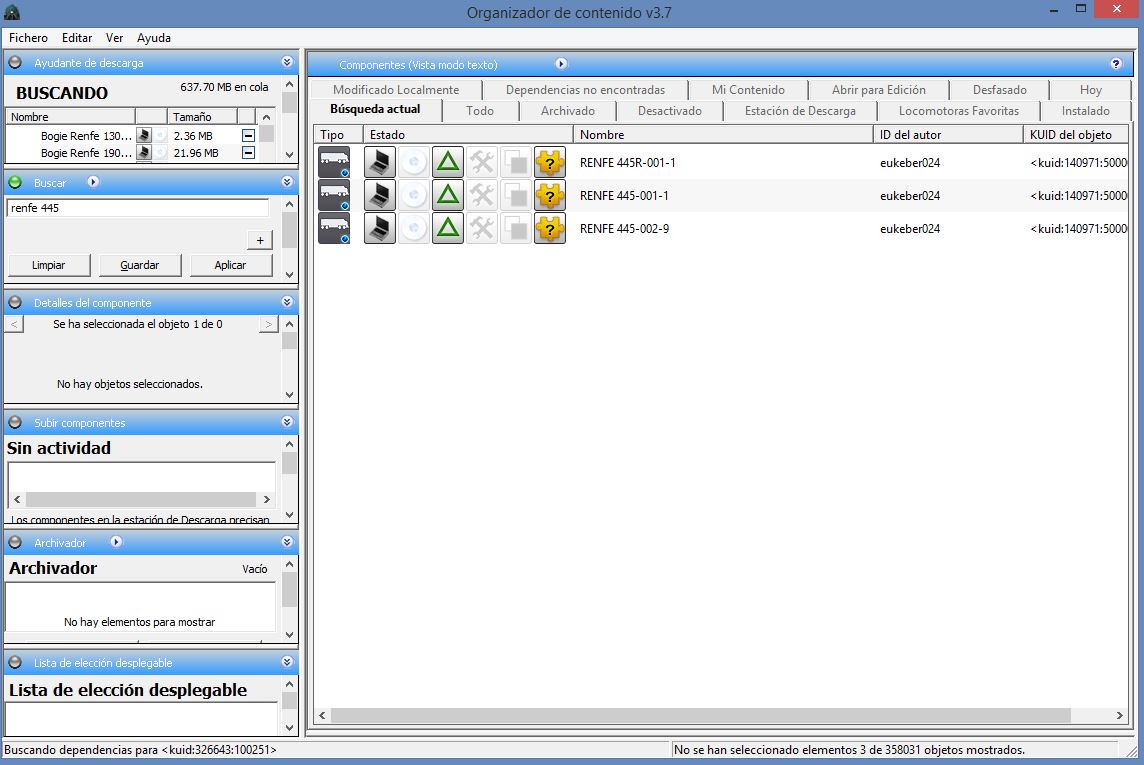 Hola, buenas tardes en su momento ya me leí el manual del juego. Pero no aclara ninguna duda de lo que me ocurre... A ver, yo por ejemplo me descargo un tren, viene en un Zip, lo extraigo y tengo el archivo CDP. Una vez tengo abierto el organizador de contenido me voy a Fichero, y selecciono la opción "Importar CDP" Selecciono el archivo y todo bien, luego me voy al buscador y encuentro los archivos de la locomotora que me he descargado. Hago lo que me han comentado en otros foros click derecho y descargar. Veo que arriba a la derecha en descargas comienza y muy poco a poco se van descargando los archivos con su click verde. Una vez ha acabado me voy a las cocheras y este es el resultado. Desde luego, no se si estaré haciendo algo mal...