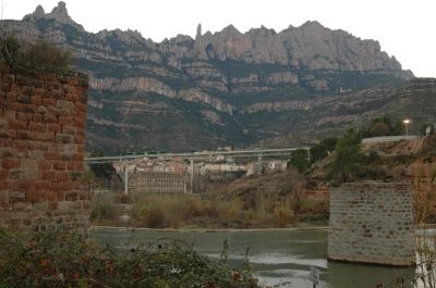 Un flamante cremallera de Montserrat pasa por el actual puente sobre el río Llobregat, mientras en primer plano observamos las pilastras del que fuera el puente original.